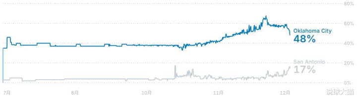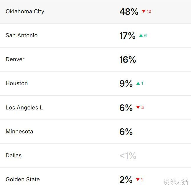 于此,可以看出雷霆依然最被媒体所看好但概率在近期出现了波动!具体到下滑了10%但依然以48%断层式领先。